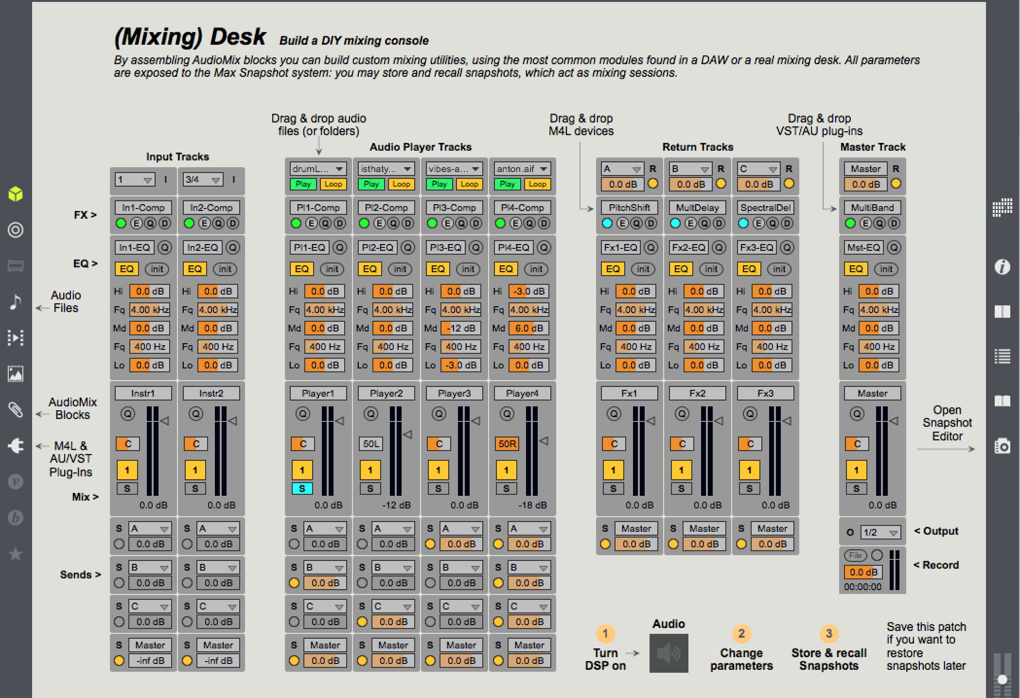 Once you’ve gotten a handle on that, you’ll find all of the AudioMix blocks in the Snippets menu of the patcher toolbar. There you will find mixer faders, crossfaders, bus sends and receives, simple audio players, EQ, I/O, and blocks to insert Max for Live devices, VSTs, and custom effects. In short, everything you need to build your own custom mixer setup complete with effect busses, channel strips, and endless routing possibilities. There are even a few convenient snippets with an entire channel strip already connected together.