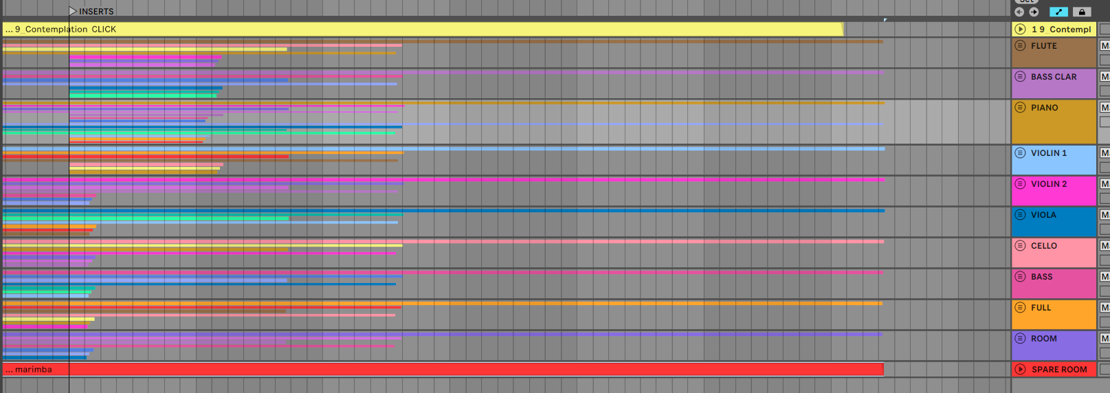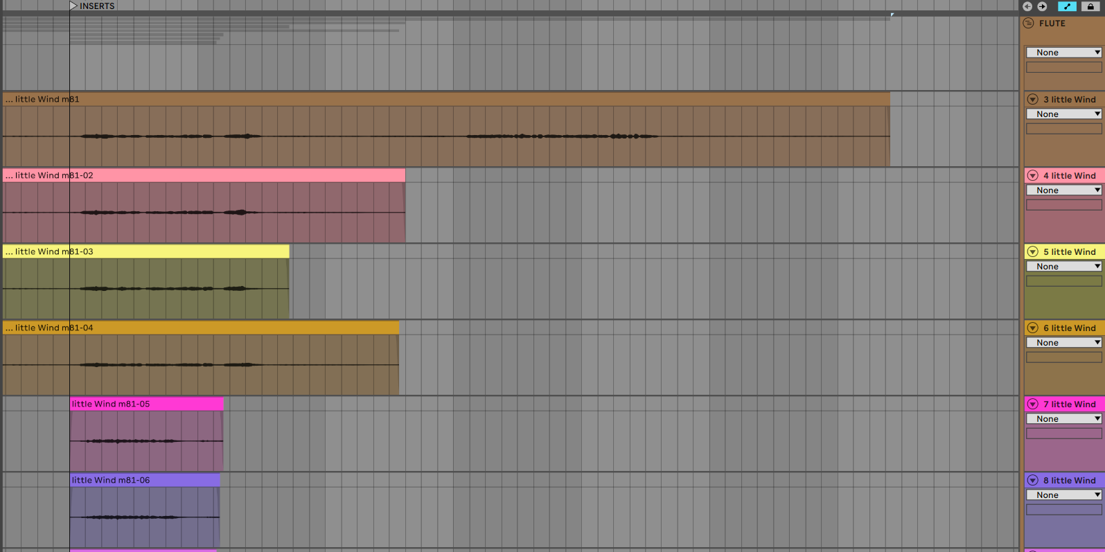 I need to take each of several hundred stems and run them through an outboard processing device, capture the altered version of each into a new audio track, move on to the next audio track, then repeat. The sessions--a classical piece for small ensemble (ten instruments, some with multiple mics, some with different takes and all having additional room mics) --are arranged into separate projects for each movement, with the different takes layered in at the correct locations. (See below and note that there are multiple takes of just one segment of this track. By arranging them this way I can choose between versions relatively painlessly, even though they were captured in another DAW, so they don't show up as "takes" per se).