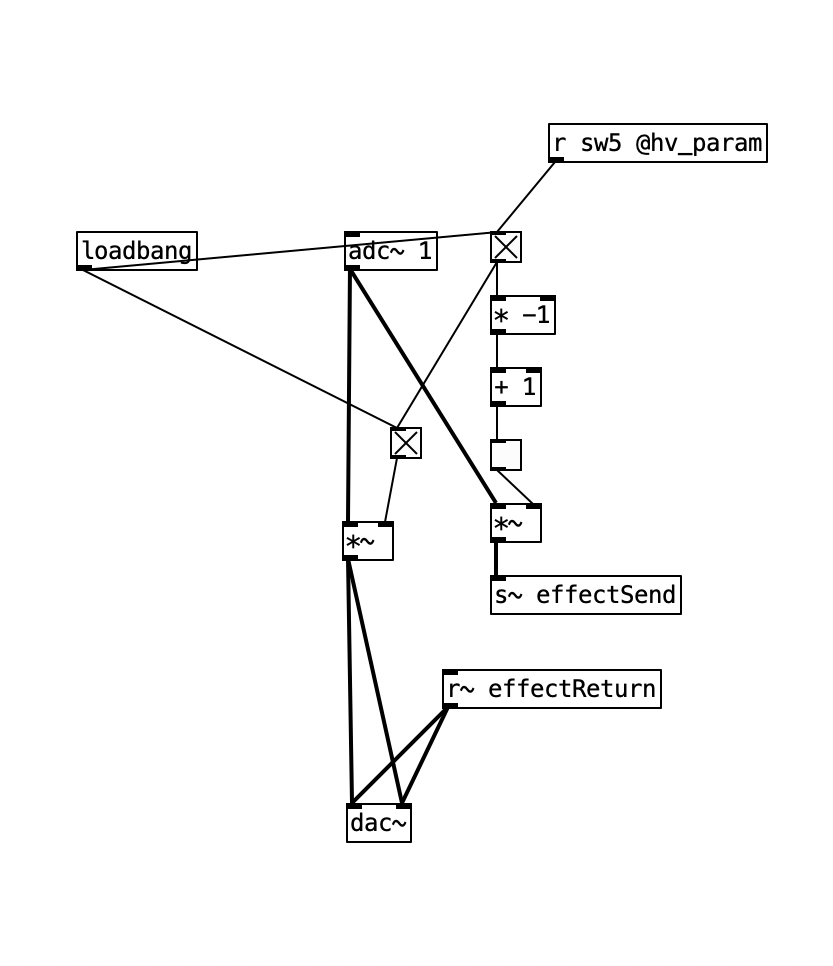 So, that might be what I need… Here’s where I get stuck: I will be triggering the effect state with a momentary switch outside of gen~. So what I get with selector is a momentary on or off of the effected signal.