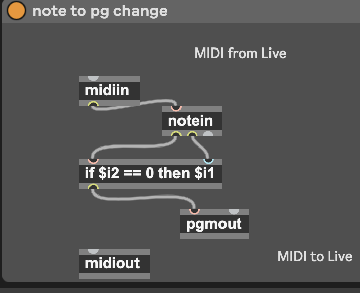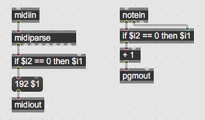 In bome any note off message will automatically get translated into a program change message based on the note number , for example the a note off message on c -2 gets translated into a program change message 00 , and a c# - 2 gets translated into a program change message 01 etc . and sent to the midi output of that track , does Max have the ability to do something similar ?