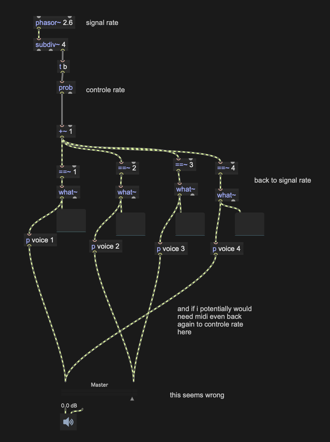 I'm working on a architecture between control-rate logic (Markov / prob) and signal-rate timing (phasor~).