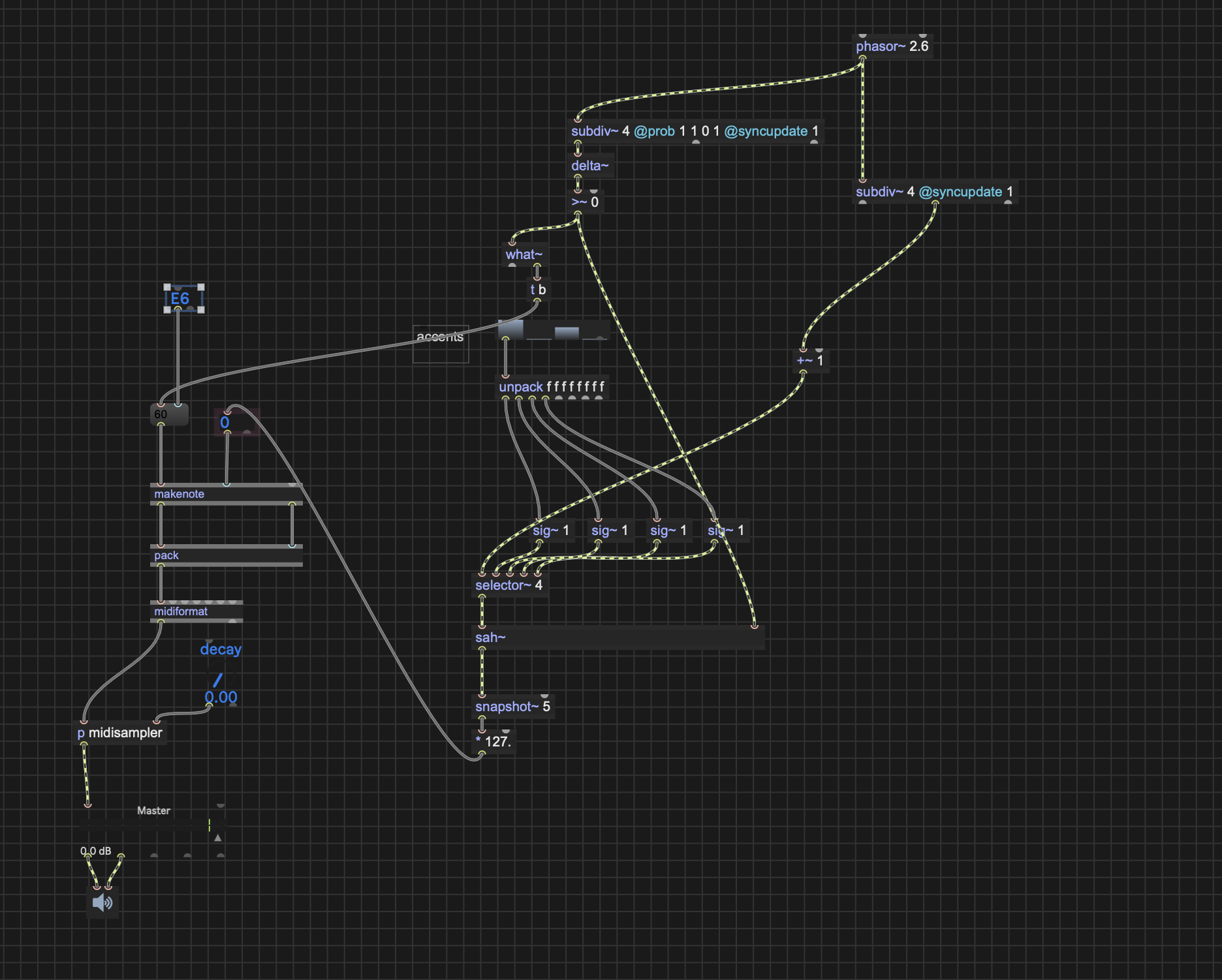 hi roman makes sense - i got a non theoretical issue now ^^ i want to achieve some master phasor based accents and it works just perfect when working in signal domain, but the controle rate translation (signal mult to velocity) causes that my midi triggers are missing the accentuated hits.