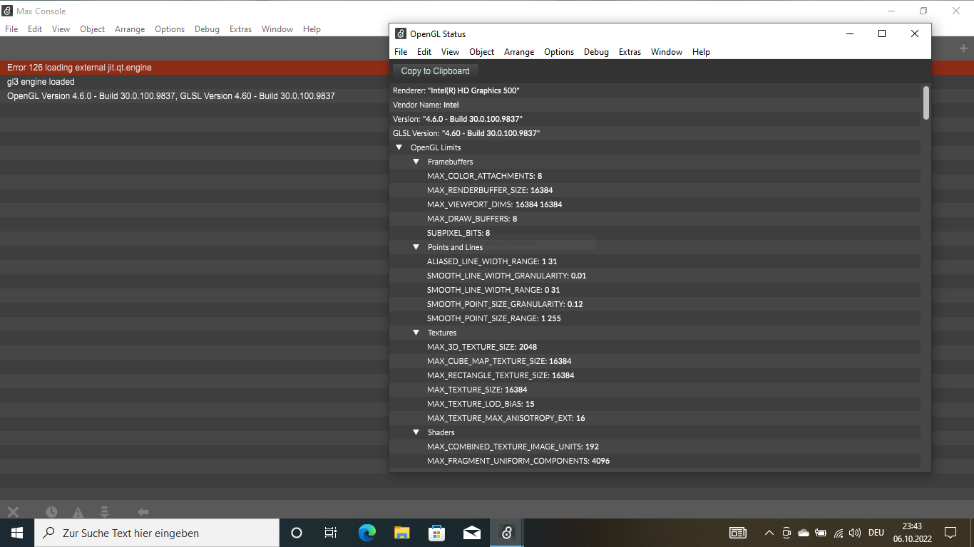 i am trying to get some jitter patches to work on a new laptop. But i get an Error 126 loading external jit.qt.engine when i am trying to load my patch. The same error appears when i open the Max Application without loading a patch and choose Options -> OpenGL Status...