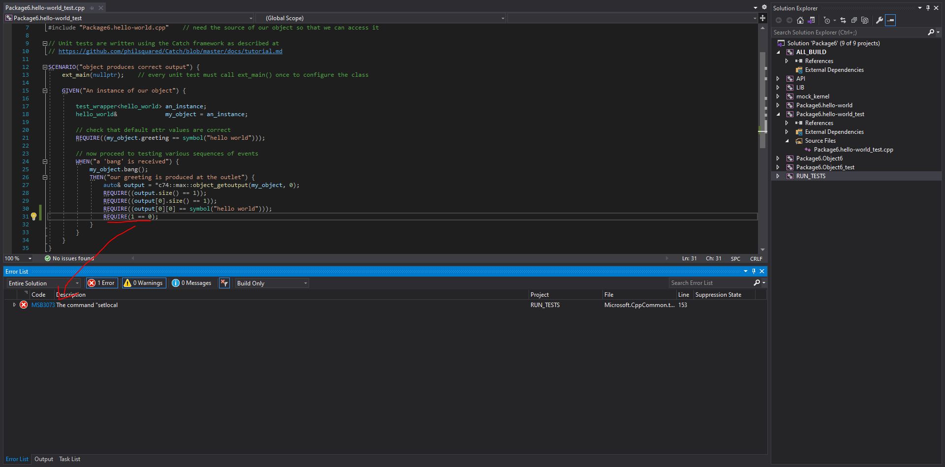 It shows the tests failed but then posts a bunch of CTEST errors. The error list also shows an MSB3073 from Micorosft.Cppcommon.targets.