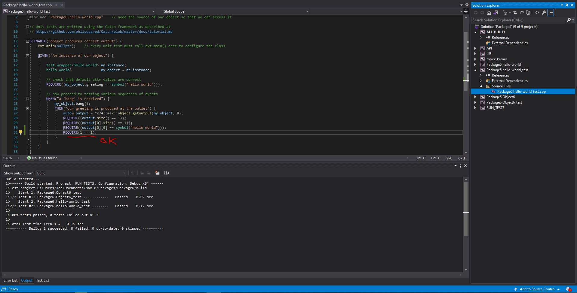 By default all the tests pass. If I build RUN_TESTS everything looks good and the output shows the tests pass. If I add
