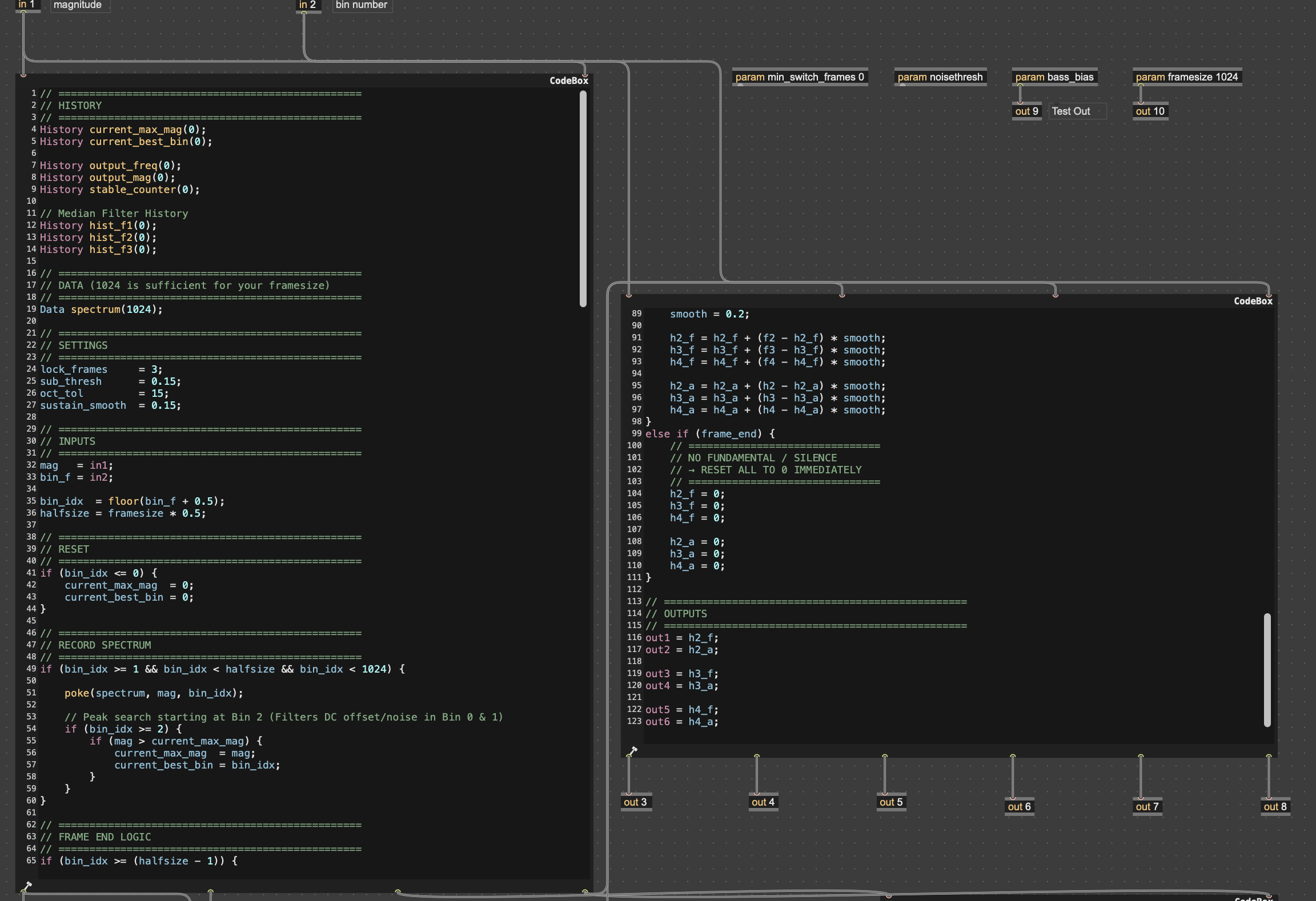 Hi everyone! I’ve been working on extending the classic FFT7 tutorial patch from the C74 docs and turning it into something more robust and RNBO-ready. The repository contains two versions: Version 1 – optimized for speed and transient response. Version 2 (v1.7) – a major rewrite where the entire logic lives inside gen~. With v1.7, my main focus was improving how the tracker reacts to monophonic signals (e.g. voice, guitar, synth). The goal was to achieve more stable tracking, reduce jitter/small frequency fluctuations, and get a generally calmer response. I’d really appreciate it if anyone has time to take a look at the code! I’m especially interested in feedback on the overall approach or anything that could be improved. https://github.com/voxuser1/A-Tom-Soundware-Developer-s-Patch-Collection/tree/main/FFT%20Tracker