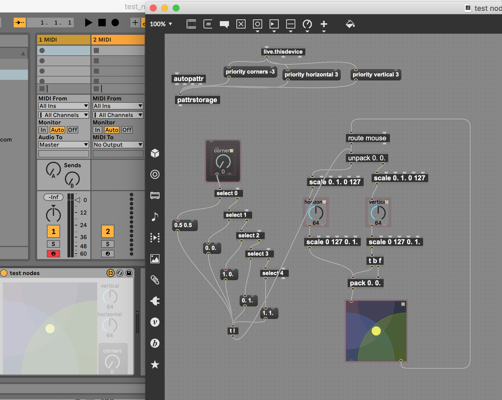 I have a nodes object, which is controlled by three live.dials. Two of them are controlling the horizontal and vertical movement of the nodes knob. The other one (corners) is a quick shortcut to put the knob in five predefined locations: center, upper left, upper right, lower left and lower right corners. All of the dials should be automated, so thy are set to "Automated and stored" in Inspector.