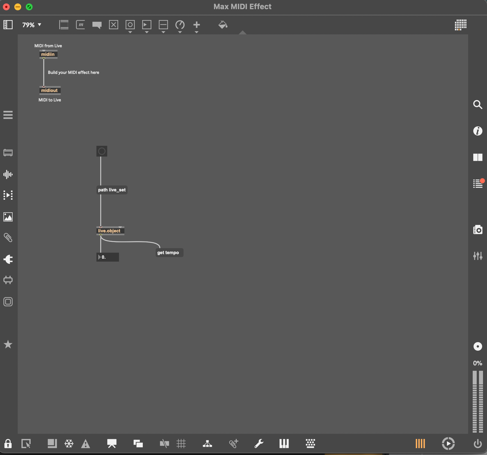 Screenshots of my current state are attached here (both the original Max patch and the Max for Live device window). I have the device loaded in a MIDI track in Ableton, Live is running, and I toggled the device in "run" mode — but the BPM still doesn't come through.