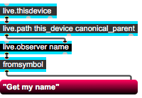 How do I get the name of a track (MIDI, instrument, or audio) in a message? So if the channel in Ableton is named "Diva 05" or whatever, and I have a M4L audio effect, how can I get that as a message in my Max patch? Seems simple but I can't find a way in the Live API. Only can find "track id"