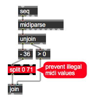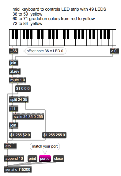 The patch is a midi keyboard to control a digital LED strip where there are 49 LEDS. From 36 to 59 (bass line) yellow, from 60 to 71 (gradation colors from red to yellow and the data is a MARKOV output) and from 72 to 84 just yellow again. Each LED lit up the color based on its corresponding MIDI note based on what note was pressed.
