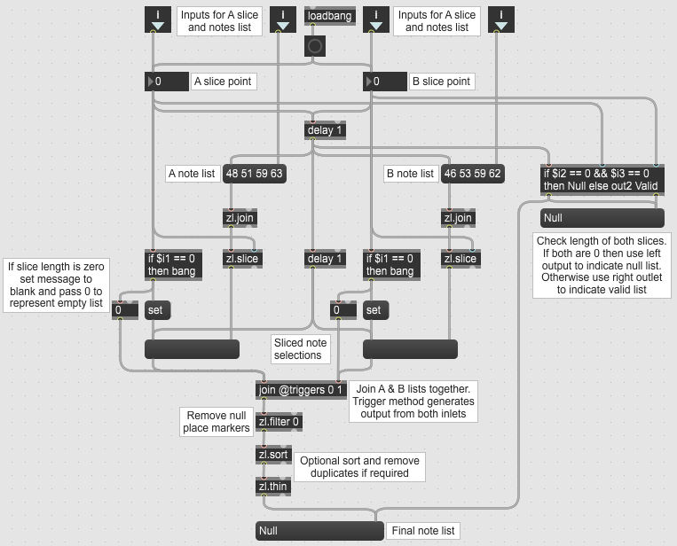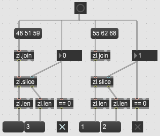 Right now I'm trying implementing this with `zl slice`. Although it seems to be working, when i or j is zero, the output of its left outlet will not be updated and all elements go to the right outlet. In this case, whether if statement is necessary in order to achieve this purpose and how? More generally, I guess the question is about finding a good way to represent empty list in Max, for example how to properly implement the process of one non-empty list combining with another empty list?