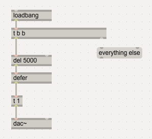 unfortunatley it is indeed a bit difficult to turn on DSP by [loadbang].