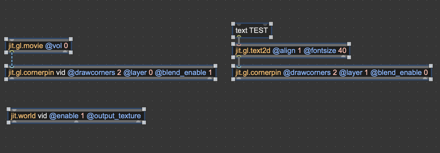 So I would do something like [jit.gl.text2d textnode @align 1 @fontsize 40] and next to that [jit.gl.node @name textnode @capture 1] with its left outlet connected to the cornerpin.