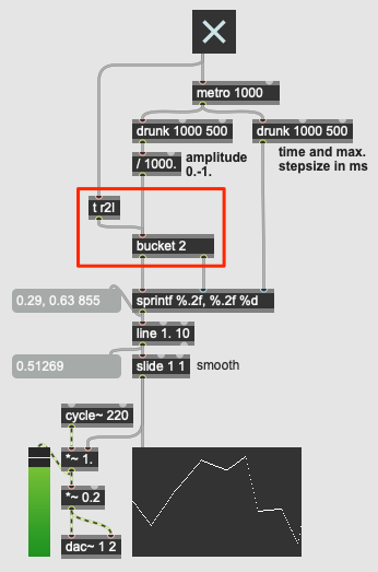 I'm trying to find a way to generate random numbers and use them in pairs to modify the amplitude of a [cycle]. I use [sprintf %i, %i %i] where the first %i is the "from" value, the second is the "to" value and the final is the ms value. These go into a [line~]. For the line to be continuously generating without clipping I need the "to" value to replace the "from" value at each iteration. So basically I need a way to store the last two numbers of an infinite list, and to be able to change the index of the stored numbers. I can't find an intuitive way to do this without using delays which would probably overburden my processor.