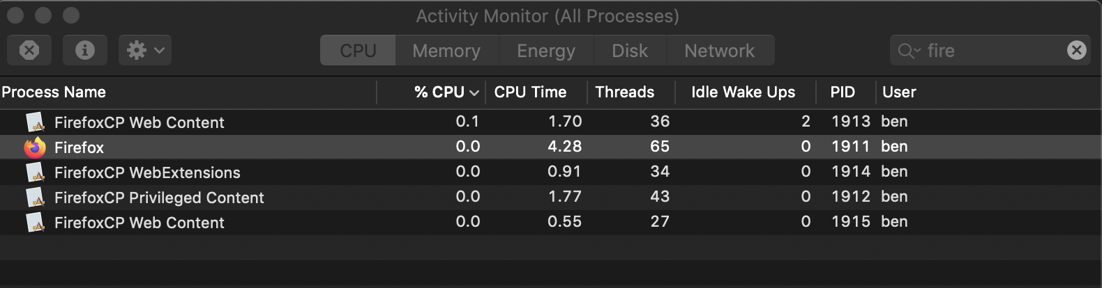 Yeah, strange, in Terminal it's giving me the "No matching processes belonging to you were found". I also tried "Firefox.app". No dice. Is there a way to find out the real name?