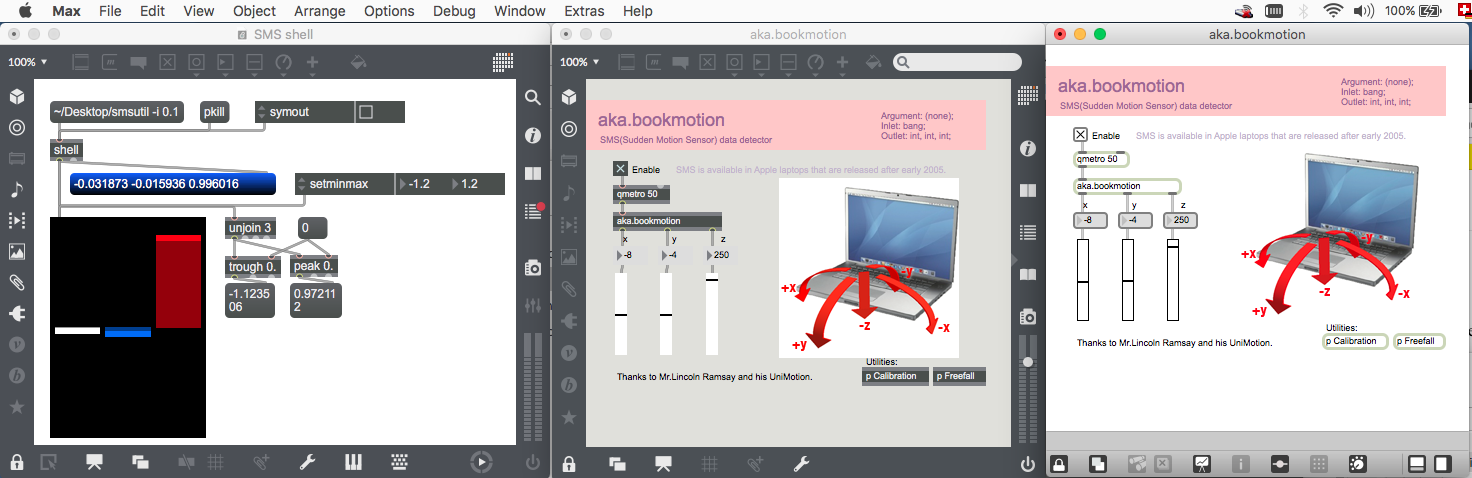 There used to be an extension that provided motion sensor from the Apple embedded accelerometer (bookmotion, from here) but it's in powerpc/intel/max4 limbo.