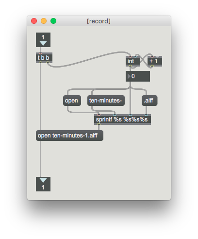 What I can't seem to figure out is how to specify that directory further. I'd like to save these files to a folder named 'recordings' which is also in the same folder directory as the patch. Of course I tried adding another sprintf message such as 'recordings/' (ending up with something like 'open recordings/ten-minutes-0.aiff' but it keeps creating it in the wrong place. Does anybody have any ideas about how one might fix this?