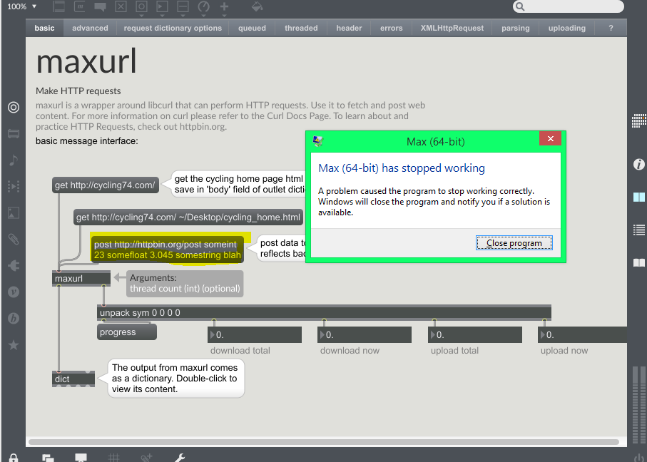 when i click the httpbin message in maxurl help max 7 and 7.1 (64-bit) crashes. I assume it is working for other people. Any ideas?