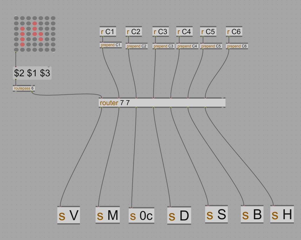 In another track I have another device that handle the routing with a Matrixctrl object (C1, C2, C3 etc... are the data per strings). In the matrixctrl object, the six 1st rows are my 6 strings (the 7th one is for a keyboard) and the column are my Live tracks (seven differents tracks here).