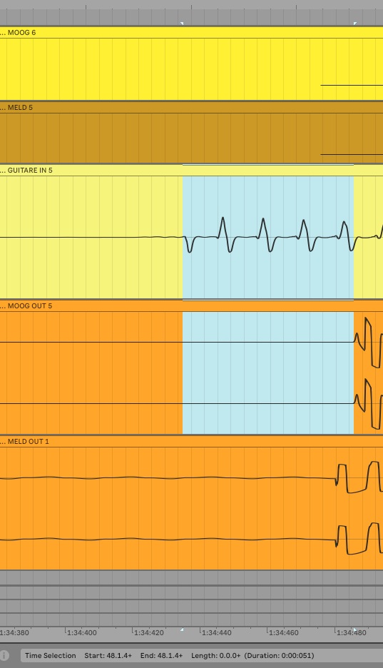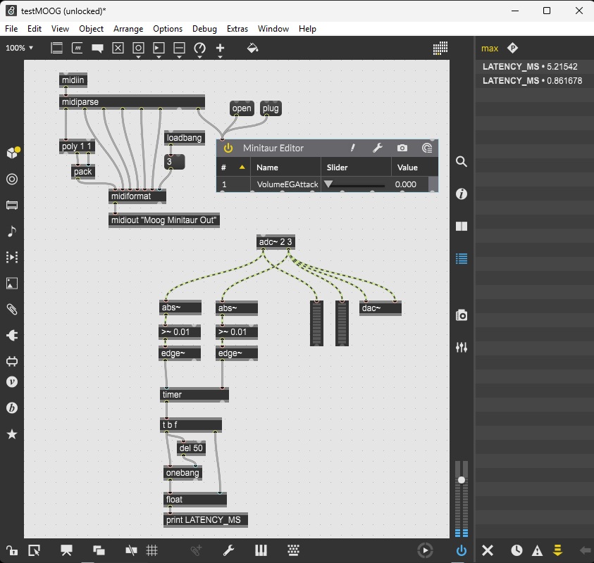 Another thing is that I tried to measure the latency directly in max, in the example below the "2" input is my guitar directly plugged in the 2nd input of my soundcard. And the "3rd input" is the direct output of an hardware synth (moog minitaur here).