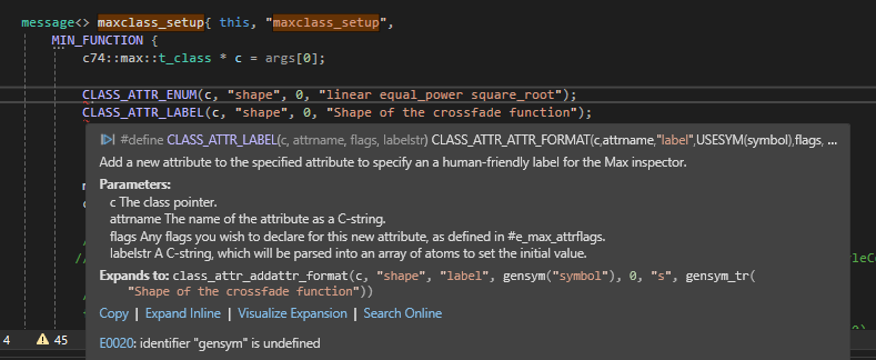 But when I do that, the linter gives an error gensym is unidentified. I tried expanding the macro and putting c74::max in front of all the max terms. But this causes a "read access violation" hard crash when the object loads. Is there any