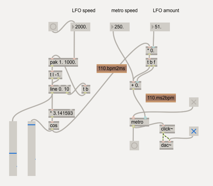 Thanks that direction - That helped a lot. I'm now detecting the edge of the phasor to trigger bangs - However, to oscillate the phasor tempo, I'm using a feedback loop two line msgs triggering each other via their end-of-ramp outlets. Is there a more elegant way to do this than the feedback rig I've routed? Attached is the updated patch.