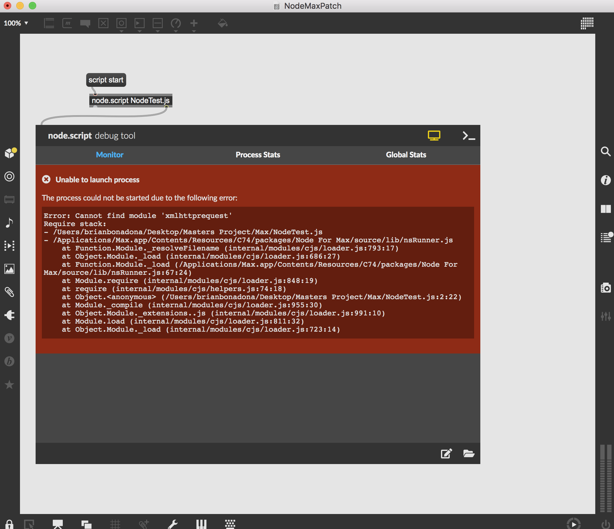Hi, I am new to Node. I can't figure out why I am getting this error message. I have the Javascript file in the same folder as the Node Max patch.