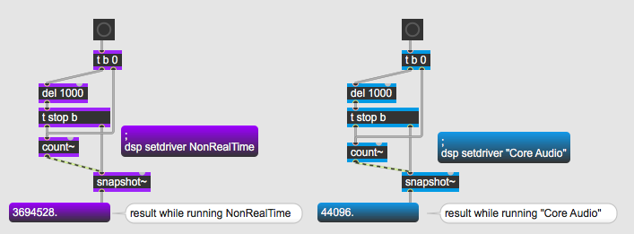 I'll make some tests to see if the ratio of NonRealTime/CoreAudio is fixed, so I can somehow "translate" the whole patch to run in non-real time.