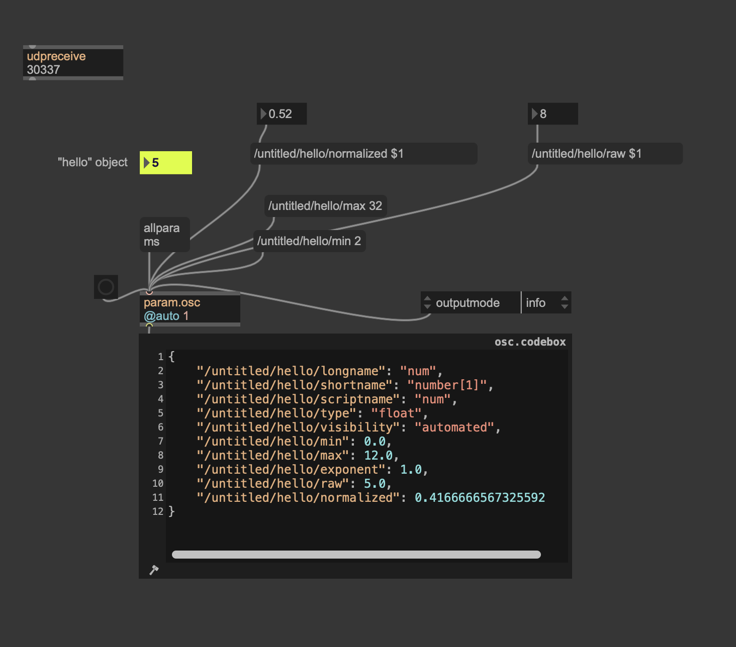 I've created a number object, enabled parameter mode and set its osc name to "hello".
