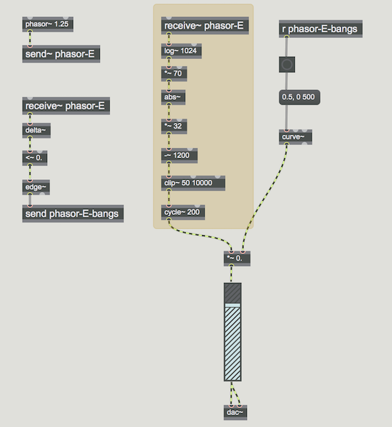 Note, this is all being used to drive the frequency of a cycle~. It seems like a very oblique way of getting a very fast frequency sweep 1.25 time a second.