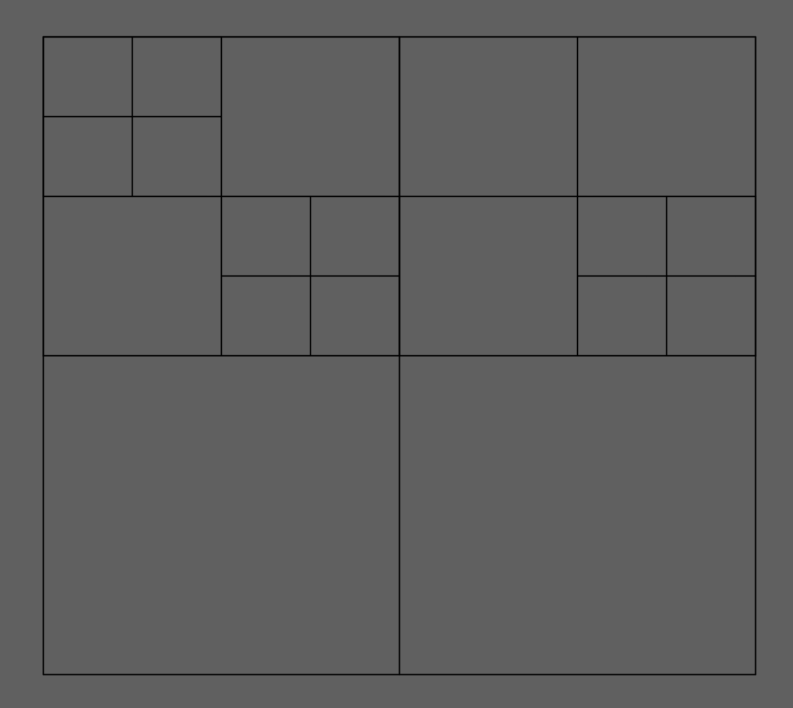 I have a question about Jitter. Assuming a grid like the one in the attached image below (the black lines are just for reference and are actually invisible), I’d like to load a single image and display it across the blocks of the grid. However, instead of showing the image identically in each block, I’d like to rotate it 90 degrees in certain cells. Is this possible to implement in Jitter? I'm also wondering if it's possible to change the grid layout in response to a bang signal. Thank you.