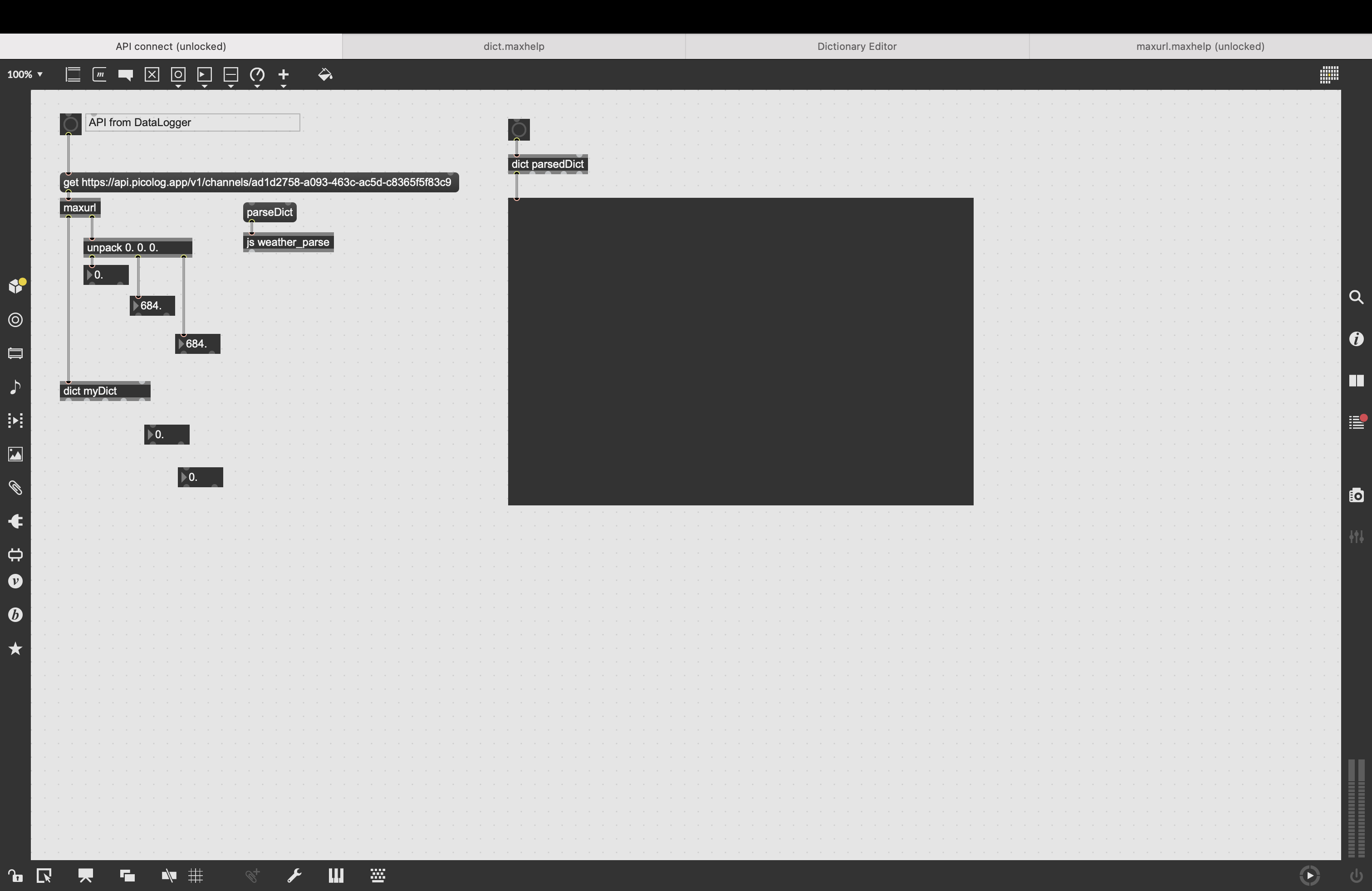 The problem here is that you need to ask maxurl to parse the result as JSON instead of plain text. For this you need to create a dict with an 'url' key containing your API url, and a 'parse_type' key set to 'JSON'. You can find an example of this is you search for tour_maxurl.maxpat in the Max search.