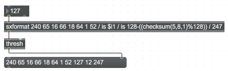 [sxformat 240 65 16 66 18 64 1 52 / is $i1 / [here is where the calculation for the roland checksum should be made] / 247]