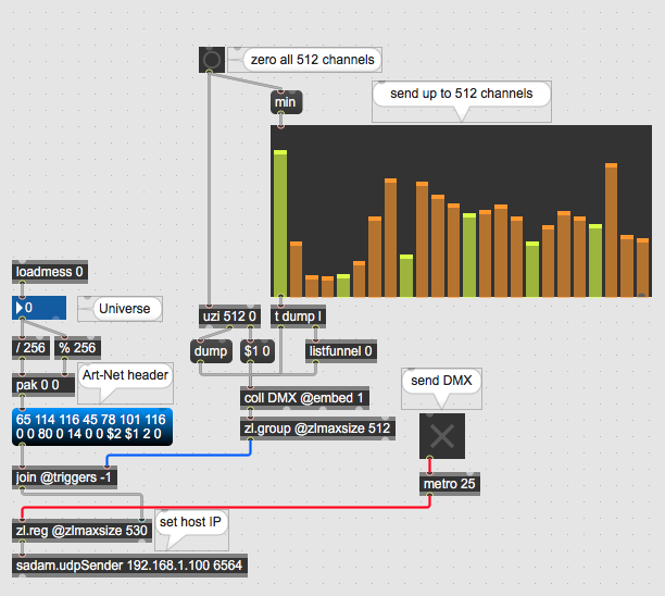 No need for the "Beam for Max" external which is quite expensive and oversized for send a few Art-Net channels.