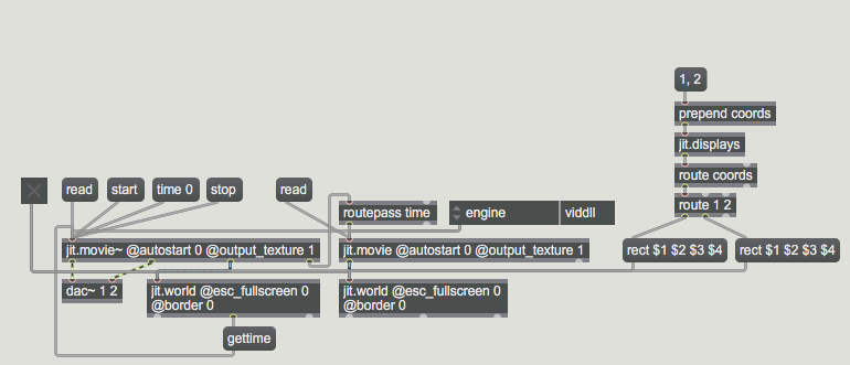 I guess my main questions are: what’s the best way to send two independent video streams to two projectors – two jit.world objects, two jit.window objects, something else entirely? Is jit.movie the right choice for playing back long video over that long a duration, or is there something better suited? And are there any general tips for keeping things stable over 8 hours – things like file formats, settings, .... ?