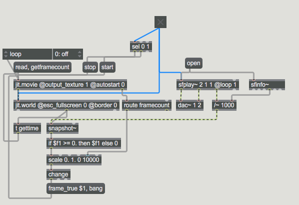 1- you merge one video and audio track and play them with jit.movie~
