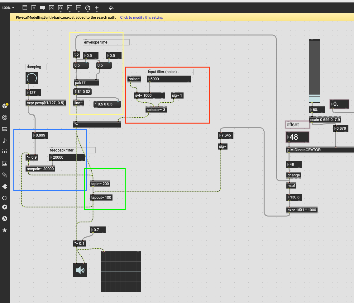 Basically i dont know what people are referring to when they say the exciter. I've attached a screensot with different coloured rectangles for each section of the patch - would you mind pointing out which area/object(s) the exciter is (in) - and let me know where to place the adsr~ to modulate it?