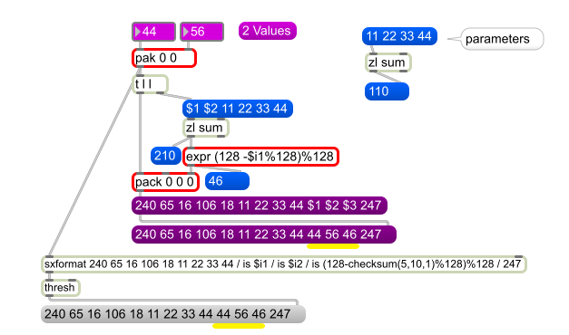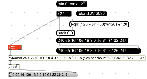 Would it be OK to ask a couple questions, please? I was trying to find out how to put together SysEx information for a Roland JV2080 and came an exchange you had with someone else about this. You provided the code: sxformat 240 65 16 106 18 3 0 16 61 / is $i1 / is (128-checksum(5,9,1)%128)%128 / 247. This code works perfectly, but I was wondering if you'd be prepared to break down the: is (128-checksum(5,9,1)%128)%128, as I don't understand how this is working fully? Is it an example of a particular type of coding? Incorrectly, I thought the formatting of the SysEx information should correspond to to the data transmission format on page 187 of the manual, but this doesn't seem to be so. Does the generic form of the message appear anywhere in the manual, as I can't see the wood for the trees.
