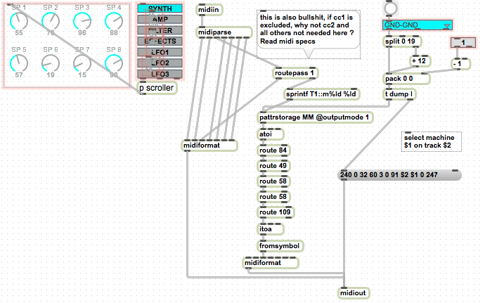 I wanted to get back to you in order to let you know that I've tried the Monomachine device you sent over. It is possible to alter each of the six tracks on the Monomachine while transmitting on the same MIDI channel. The SysEx sends successfully. However, I can't seem to get the CC control to work. Could I ask, what is the reason of the routing objects on the left side of the patch? They seem like a random set of parameters, but also I don't understand the function of the object itself within the patch.