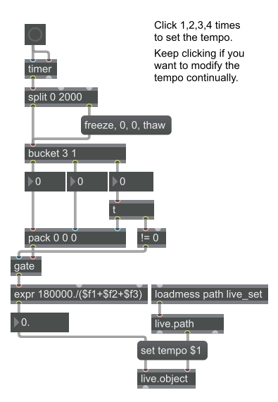 I'm trying to alter the following example (image below) of using a tap tempo patch to set Ableton's tempo. This is one element in a larger patch.