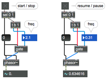 phasor~ has no real start or stop, it simpy runs at set freq,