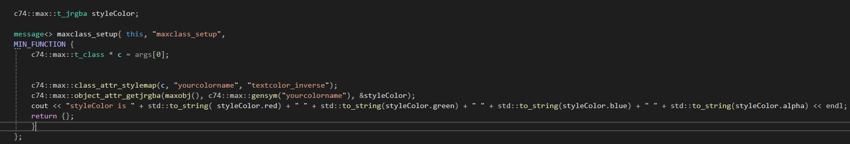 Looks like it is possible in a JS object. But I'm not clear on how to do this with the Max SDK or, preferably, Min Devkit. Is there an equivalent of max.getcolor() that is available to the Max SDK or Min?