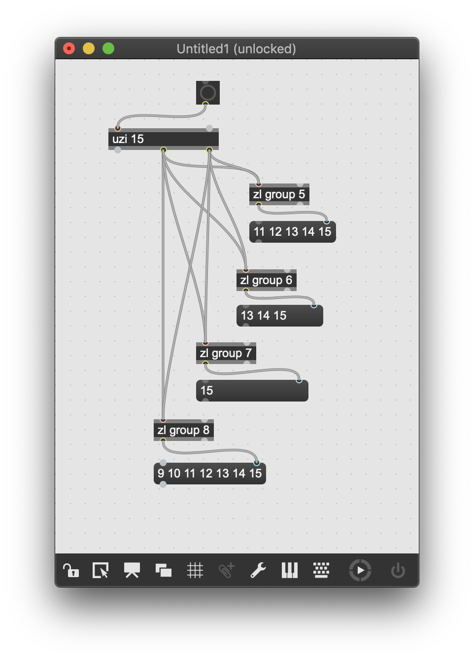 zl.group outputs always when the amout of items is reached. If you bang zl.group it outputs whats in the buffer. So zl.group 7 outputs "1 2 3 4 5 6 7" "8 9 10 11 12 13 14" then you bang it with uzi "15". Use the "print" object to see the output in the max console.