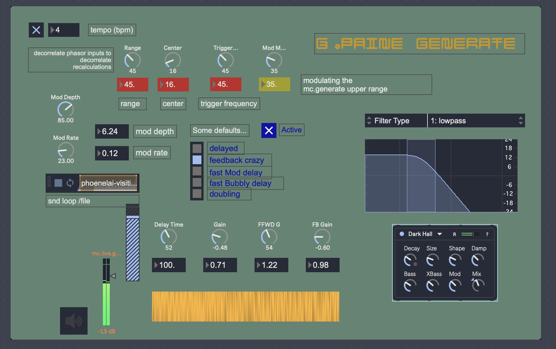 This is especially true with the presets named "Nervous" - they really do live up to their names! It's interesting that for doing the effects, you chose to use mc.teeth~. This is not something I've played around with a lot. Is comb filter manipulation a typical tool in your creations?