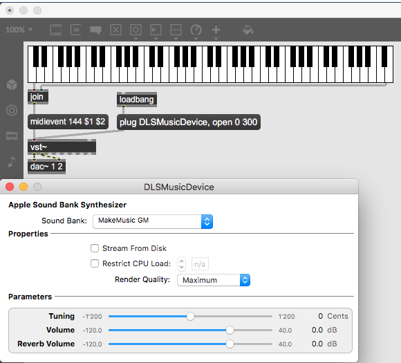 I wanted to use this approach so it would work on a stranger's mac without the need for plug ins. I think the approach that I need is to send midi volume to the DLS synth. Can you please remind me how to do that? (I'm getting back into Max after a pause, and I am very rusty! I used to know how to do this at one point...)
