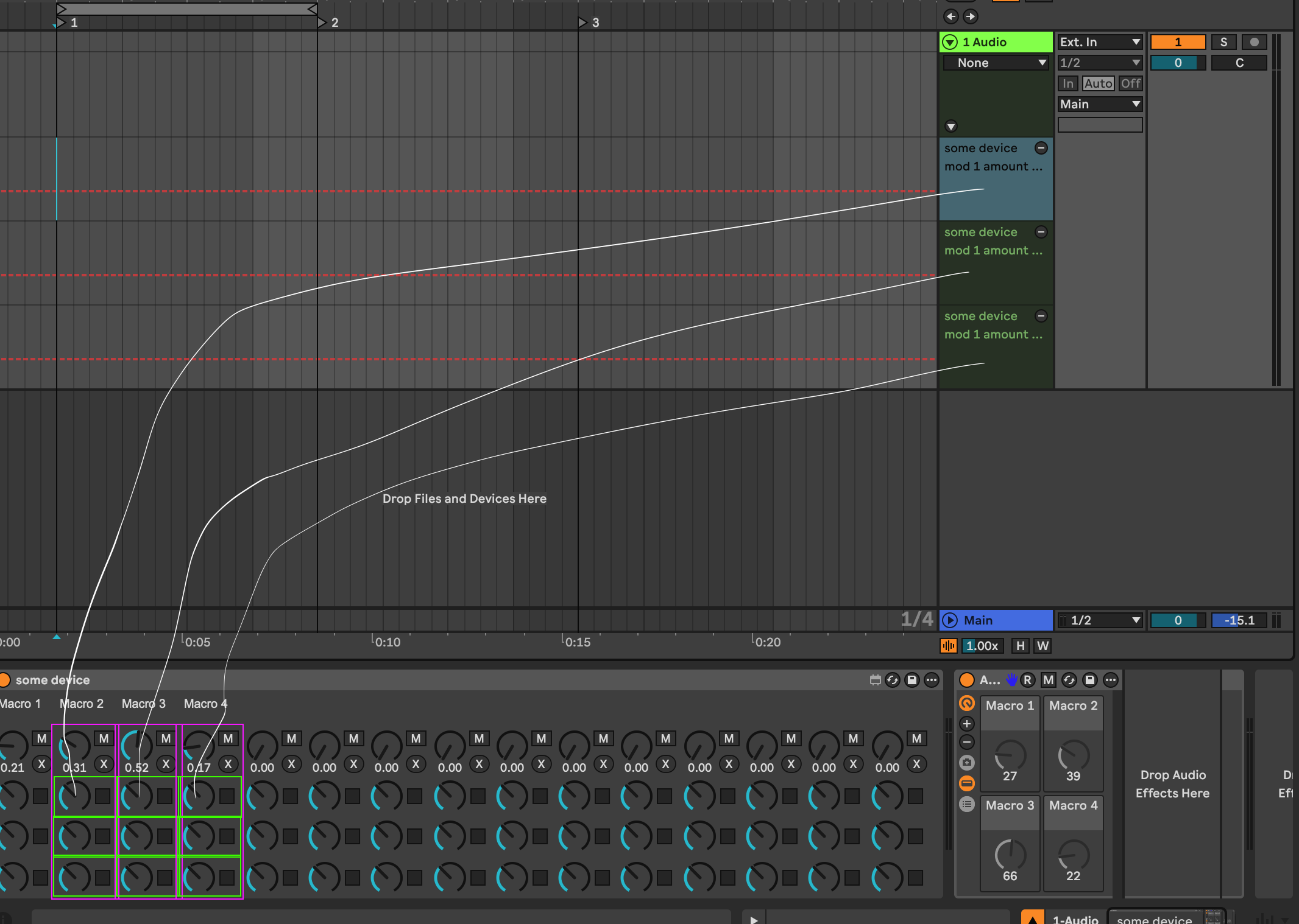 Is there a way to rename a live.dial or any other similar ui item dynamically so that they would appear in the Live's automation lanes named accordingly? In the screenshot each violet column is a separate bpatcher. I wish I could pass in the column names "Macro 1", "Macro 2", "Macro 3" into the dials and through that rename them. Or is there a workaround or something?