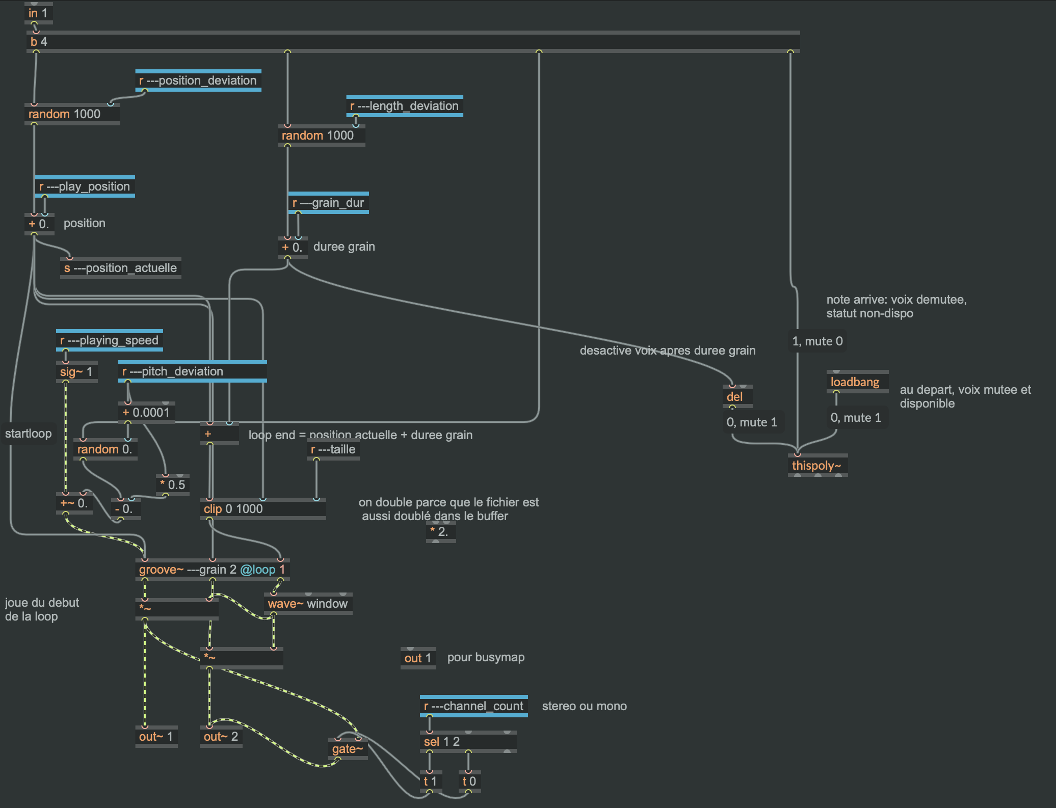 I need to revise the way I patched it, because in my patch I generate a grain defined by a loop startpoint and and a loop endpoint. This is convenient because it allows the sync output to drive the reading of a buffer containing the envelope shape. But in practice it doesn't allow for crossing the end.