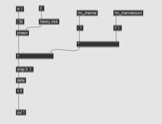 This mc.gen~ patch is a click generator for a multichannel granulator taken from the interesting granulator tutorial (youtube) by toneparticle. I would like to have a fast "attack" of the granulated stream. The only solution that i end up with, thanks to an old topic here on the forum, is resetting the phase of the phasor with [history (click)] and a [click 1] message sent from outside mc.gen~.