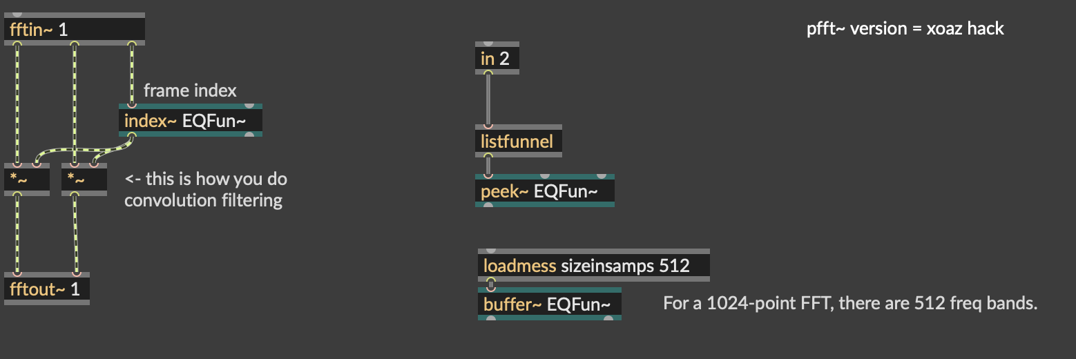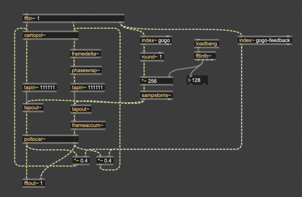 The patch above also applies delays, and again, because this is working with previous values, we want to make sure that the bins always match. For bin6 to read a previous value of bin6, we need to read 128, 256, 512, or some other multiple of 128 samples ago. Otherwise we'd end up moving data from one bin to another (which can be interesting sonically, but is not what this patch is intending to do.) That's why the patch uses a round~ operator, multiplied by the frame size, to specify the delay time -- it's always a whole number multiple of 128.