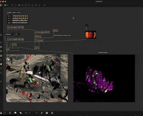 With generated 3D content, these velocity vectors are straightforward to obtain: any 3D object rendered with jit.gl.material or jit.gl.pbr can output them directly. With video sources, however, it’s more complicated, because the velocity vectors have to be estimated via video analysis.
